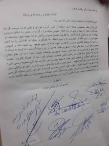 “بیشتر کارهای رییس شورای ولایتی خودسرانه است، در تمام کارها را بدون مشورت سایر اعضای شورا انجام میدهد، ما امروز اعلان میکنیم ارسال مکتوب های تعین هیات و ابراز نظرهای رسمی زمانی مرعی الاجراء میشود که نظر اکثریت اعضای شورای ولایت درآن دخیل باشد و تصامیم شورای ولایتی زمانی قابل اجراء میگردد که به تصویب اکثریت اعضای شورای ولایتی برسد“
