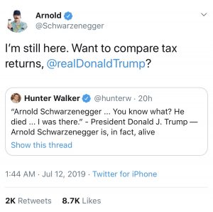 هانتر واکر، خبرنگار یاهو نیوز در توییتر خود نگاشته است که دونالد ترامپ، رئیس جمهور امریکا در نشستی در کاخ سفید خبر مرگ آرنولد شوارتزنگر، هنرپیشه معروف امریکایی را اعلام کرد و گفت که شاهد مرگ وی بوده است.