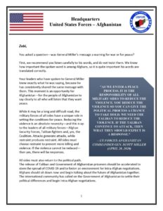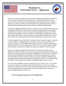 آقای لیگیت در‌ اعلامیه‌ای به نقل از جنرال میلر همچنان می‌گوید، این مسوولیت همه طرف‌های نظامی است تا خشونت‌ها را کاهش دهند: «شما (طالبان) با کاهش خشونت‌ها فرصت می‌دهید تا روند سیاسی به نتیجه برسد. ما از طالبان می‌خواهیم که خشونت‌ها را کاهش دهند و اگر طالبان به حملات شان ادامه دهند، انتظار پاسخ را باید داشته باشند.»