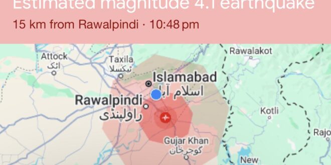 Read More »شب قبل یک زلزله نسبتا شدید شهر های اسلام آباد، راولپندی و گوجر خان در پاکستان را تکان داد. خبرگزاری پیشگو، بر اساس منابع زمین سنجی کشور پاکستان این زلزله دقیقا ساعت ۱۰:۴۸ دقیقه شب گذشته ۲۷بر ۲۸ دلو ۱۴۰۳ هجریخورشیدی رخ داده است که مرکز این زلزله نیز …